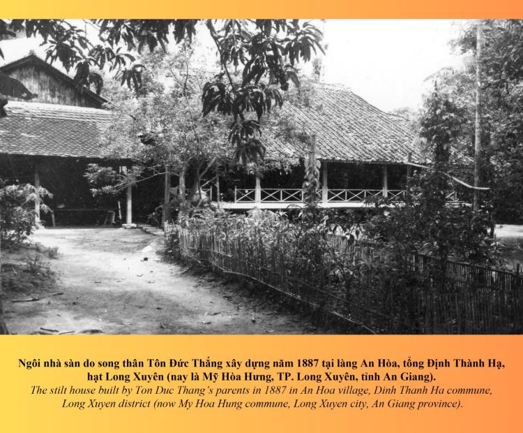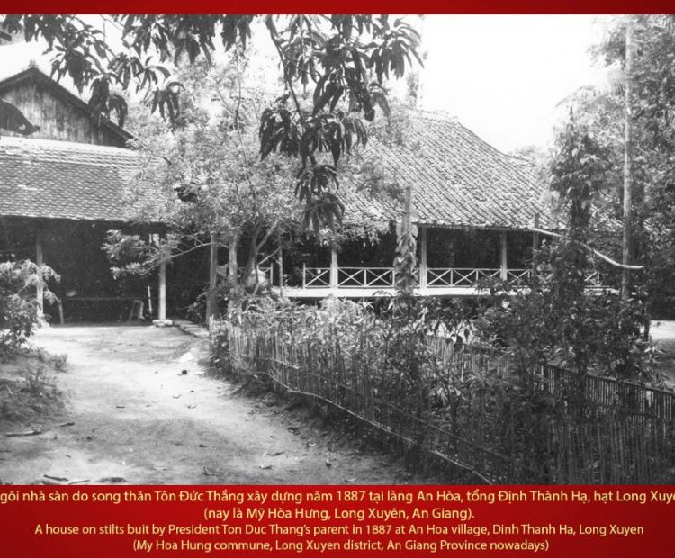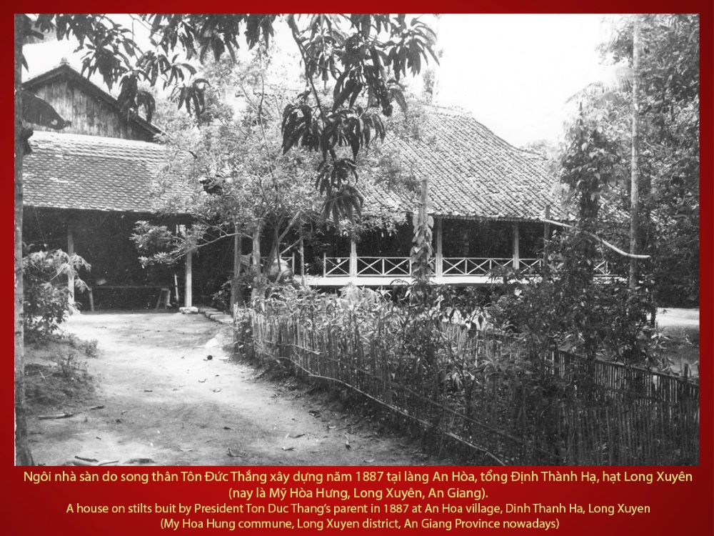 Ngôi nhà này do song thân của Bác Tôn xây dựng vào năm 1887. Sau, được người em trai thứ tư của Bác là Tôn Đức Nhung có sửa chữa một lần vào năm 1932 (nhưng vẫn giữ y theo lối kiến trúc hình chữ Quốc (nho), mái lợp ngói ống, sàn lót ván, ngang 12 mét, dài 13 mét, rộng hơn 150m2. Bên trong, ngôi nhà vẫn còn lưu giữ hai bức ảnh bán thân song thân Bác là ông Tôn Văn Đề và bà Nguyễn Thị Dị, một tấm ảnh Bác Tôn chụp năm 18 tuổi, và một ảnh chụp tại chiến khu Việt Bắc lúc Bác làm Chủ tịch Mặt trận Liên Việt, gửi về gia đình có chữ ký với dòng chữ ở phía sau “Kính biếu mẹ già và mấy em. Ngày 24 tháng 7 năm 1951”.