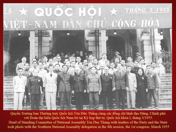 Từ năm 1948, đồng chí Tôn Đức Thắng là người điều hành, Quyền Trưởng Ban Thường trực Quốc hội. Bác nói: “Quốc hội nước Việt Nam Dân chủ Cộng hoà do nhân dân toàn quốc bầu ra đã nhất trí ủng hộ Chính phủ từ cuộc đấu tranh vũ trang 9 năm kháng chiến đến cuộc đấu tranh chính trị hiện nay. Trước một giai đoạn mới của cuộc đấu tranh, Quốc hội kêu gọi toàn thể nhân dân từ Nam chí Bắc và kiều bào hải ngoại hãy tăng cường đoàn kết theo Cương lĩnh của Mặt trận Tổ quốc Việt Nam,… Toàn thể đồng bào quyết đòi cho được lập lại quan hệ giữ hai miền Nam, Bắc và chính quyền miền Nam phải mở hội nghị thiệp thương với Chính phủ Việt Nam Dân chủ Cộng hoà. Lực lượng đoàn kết của toàn dân ta, được các nước bạn và nhân dân yêu chuộng hoà bình trên thế giới ủng hộ, sẽ ngày càng lớn mạnh, nhất định sẽ thống nhất được Tổ quốc”.